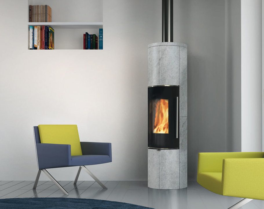Piec opalany drewnem. Duża szeroka szyba pionowa, podkreślająca kierunek płomieni.