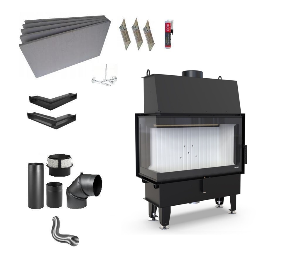 Wkład kominkowy DEFRO IMPULS M BL BLACK LINE w zestawie z akcesoriami potrzebnymi do budowy kominka.