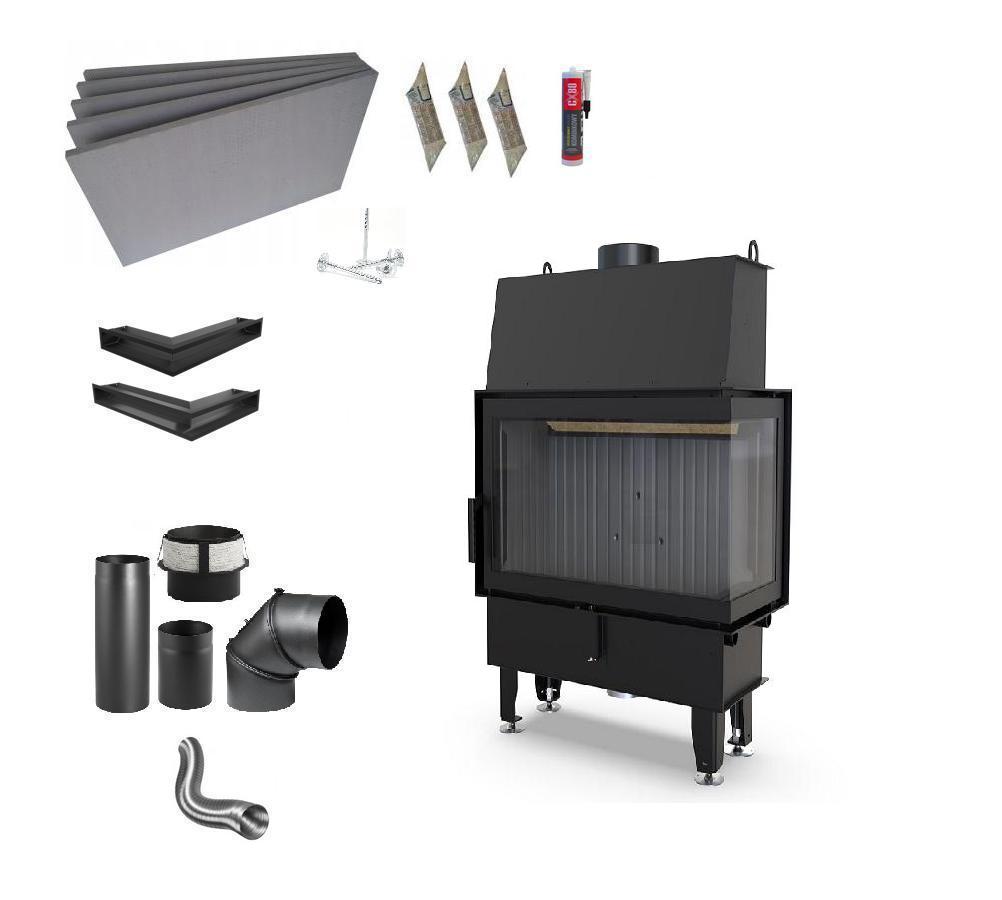 Wkład kominkowy DEFRO IMPULS S BP BLACK LINE z czarną ceramiką w zestawie z akcesoriami potrzebnymi do budowy kominka.