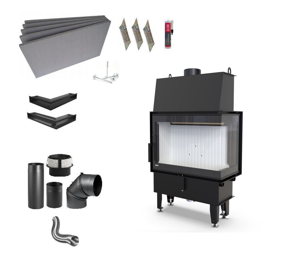 Wkład kominkowy DEFRO IMPULS SM BP BLACK LINE w zestawie z akcesoriami potrzebnymi do budowy kominka.
