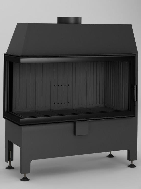 Narożnikowy wkład kominkowy został wyposażony w ceramikę akumulacyjną wykonaną w modnym czarnym kolorze, oraz panoramiczne drzwiczki z bocznym przeszkleniem dla pełnego widoku ognia. Szerokie drzwiczki powiększą optycznie wnętrze salonu, a wizja ognia staje się jeszcze piękniejsza i widoczna pod kątem. Ergonomiczny i wentylowany uchwyt do otwierania drzwiczek w kolorze czarnym podkreśla jego wyjątkowość i dodaje elegancji. Standardowym wyposażeniem są nóżki do regulacji wysokości wkładu, oraz króciec doprowadzenia powietrza z zewnątrz.