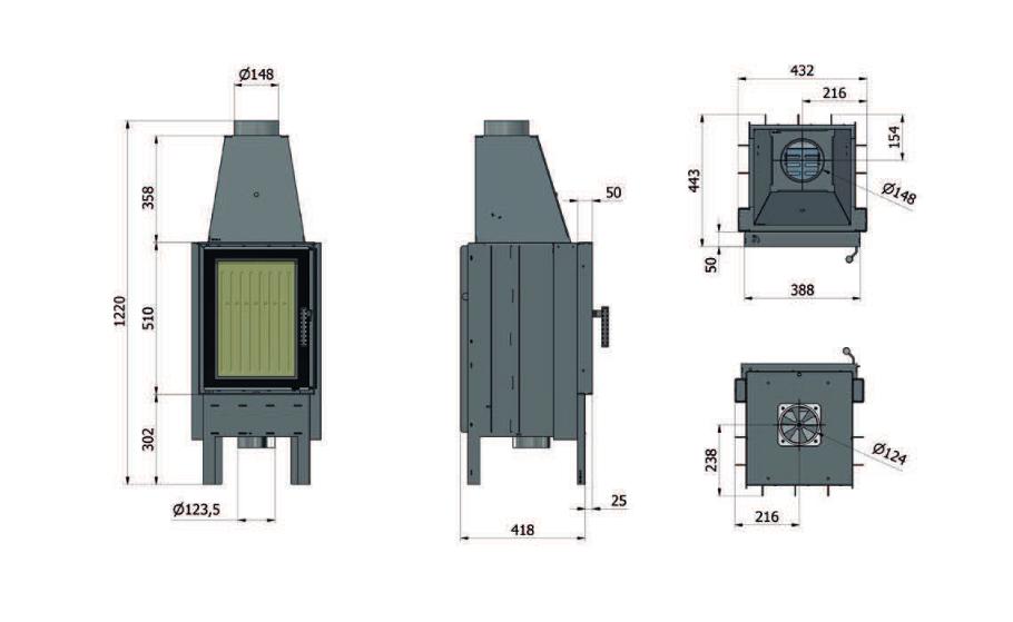 Radiatory po bokach i z tyłu wkładu – usztywnienie konstrukcji i zwiększenie powierzchni wymiany ciepła – trwałość i efektywność na zwiększonym poziomie Nóżki i śruby dla ustawienia wkładu i zniwelowania nierówności podłoża, puszka z króćcem do podłączenia powietrza do spalania z zewnątrz budynku – komfort montażu
