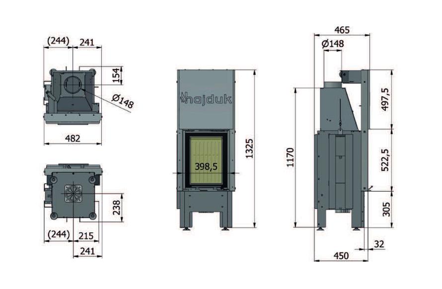 Radiatory po bokach i z tyłu wkładu – usztywnienie konstrukcji i zwiększenie powierzchni wymiany ciepła – trwałość i efektywność na zwiększonym poziomie Nóżki i śruby dla ustawienia wkładu i zniwelowania nierówności podłoża, puszka z króćcem do podłączenia powietrza do spalania z zewnątrz budynku – komfort montażu