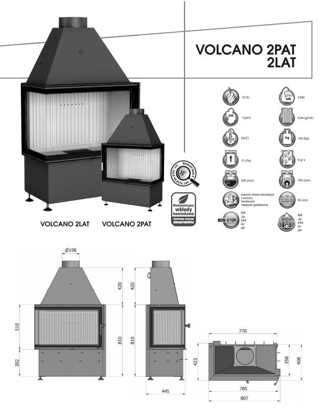 Volcano 2PAT Door dimension: 785×425 / 510 mm Nominal power: 9 kW Heating operation range: 5 – 12 kW Energy efficiency: A Average efficiency: 81% CO emission: 1.25 g / m3 Dust emission: 0.015 g / m3 Exhaust gas temperature: 287 degrees C. Flue outlet: 200 mm Air inlet: 150 mm Fuel type: hardwood, sawdust briquettes Log length: 50 cm Nominal loading: 3 kg Construction: steel and chamotte Weight: 150 kg